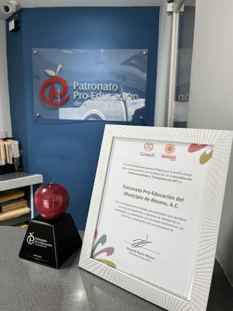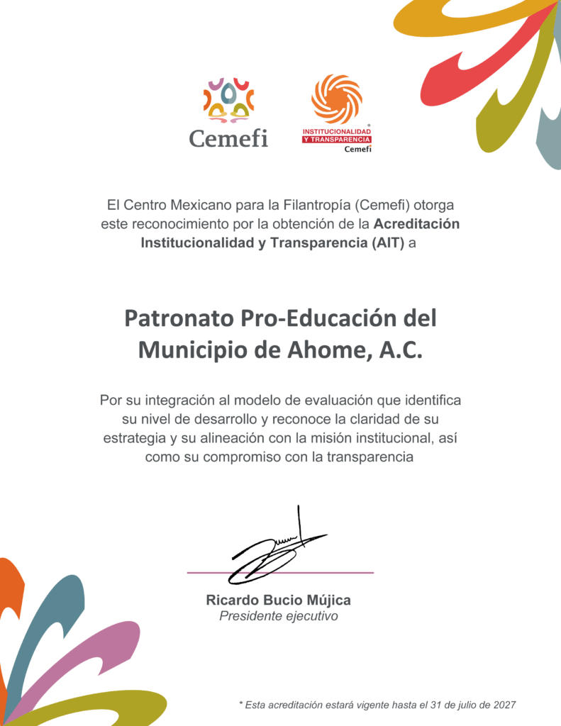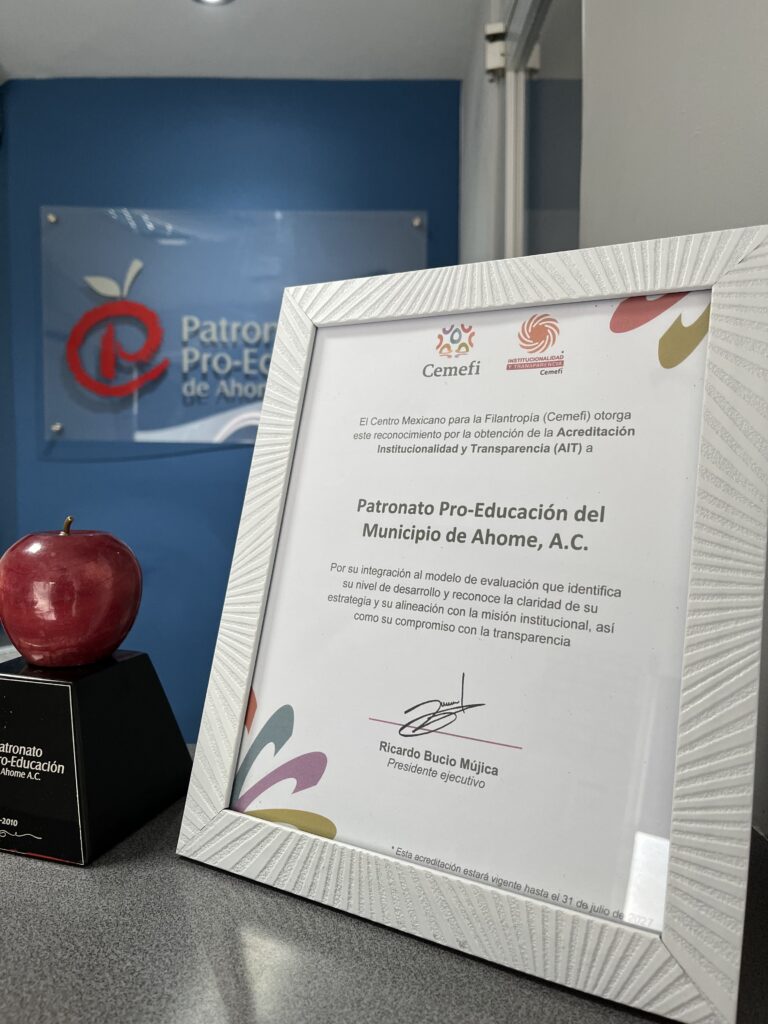 Nos enorgullece compartir que el Patronato Pro-Educación del Municipio de Ahome, A.C. ha recibido formalmente el reconocimiento por la Acreditación en Institucionalidad y Transparencia (AIT).